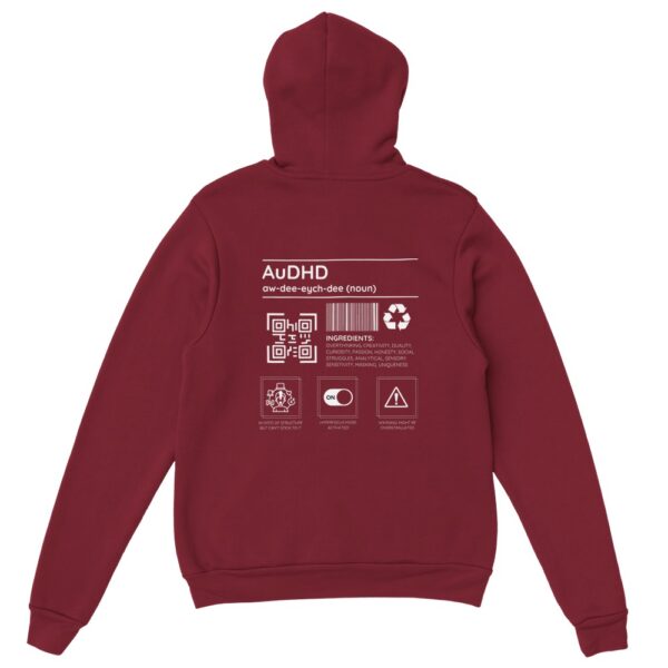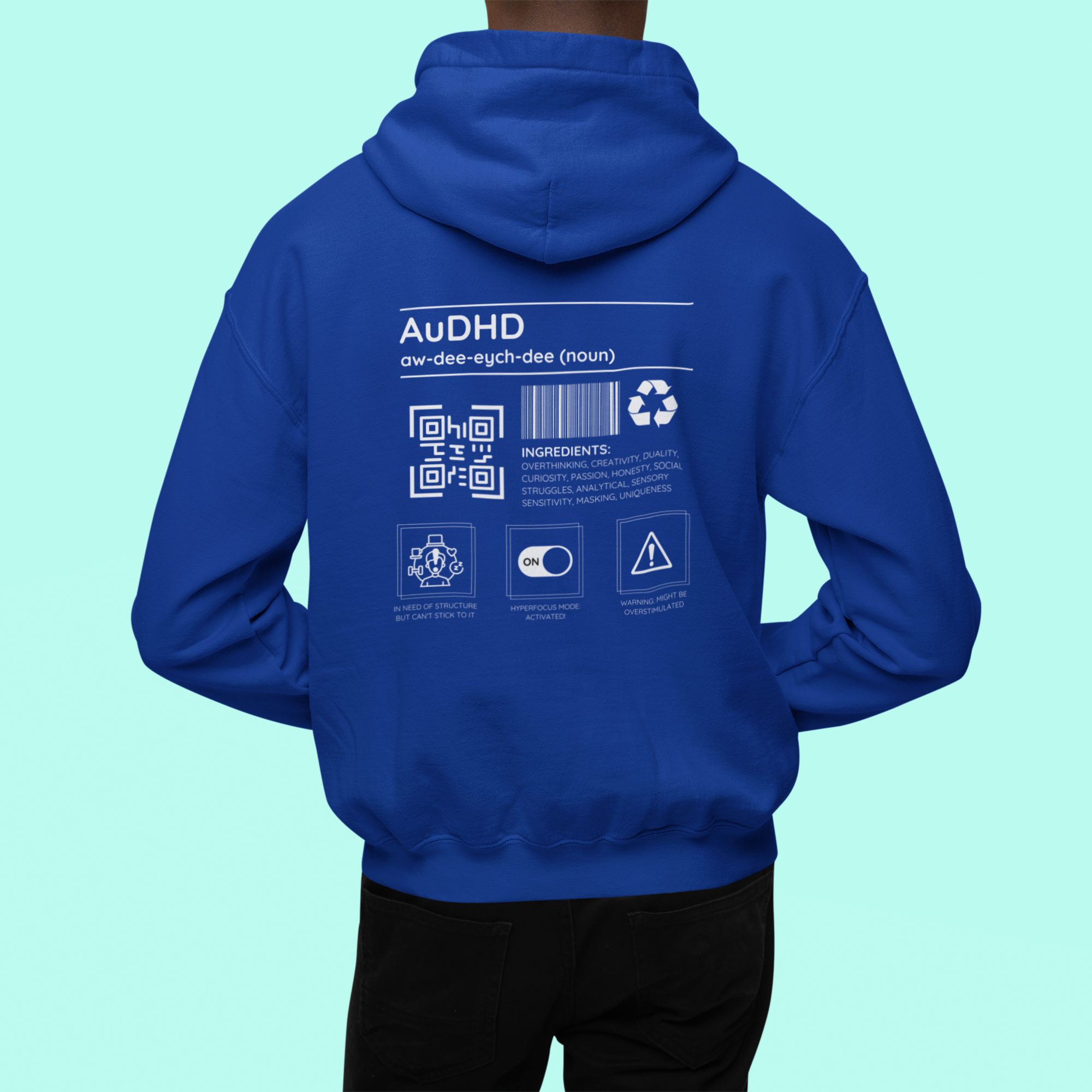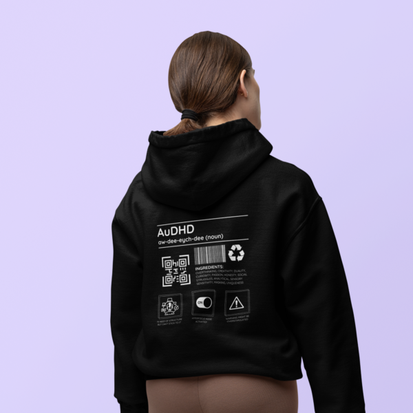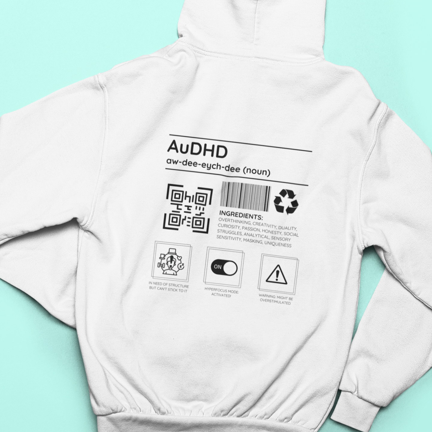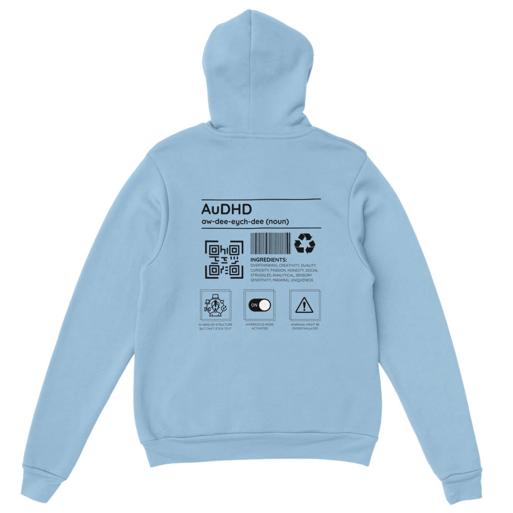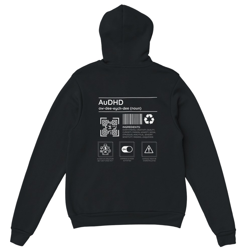 Autism meets ADHD! This hoodie is all about celebrating the beautifully chaotic blend of autism and ADHD with a playful design full of personality. Packed with humor and honesty, it lists “ingredients” like creativity, overthinking, and masking—basically, the recipe for a neurodivergent superstar.
