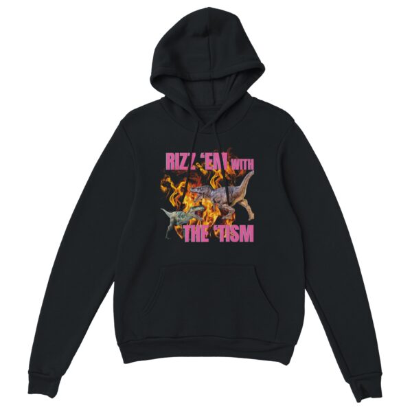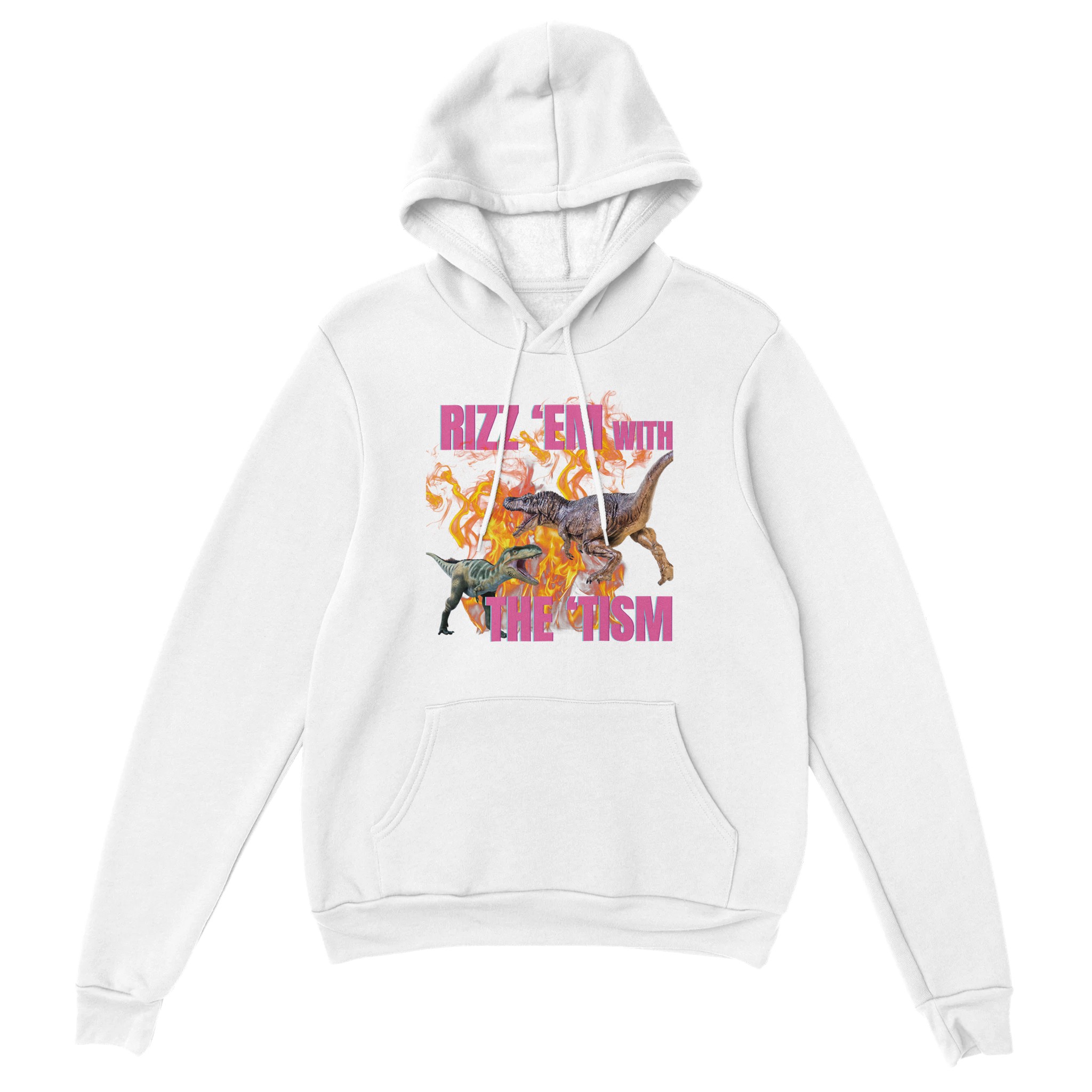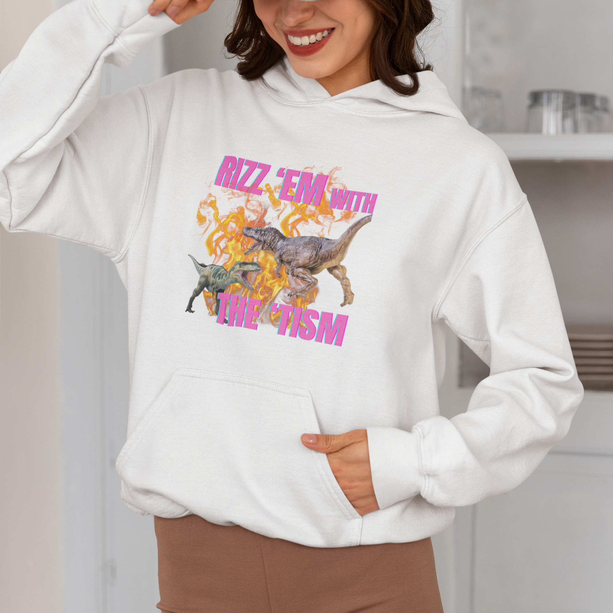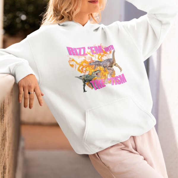 Bring the humor and confidence with this “Rizz ‘Em With the ‘Tism” Dinosaur Hoodie! Featuring two epic dinosaurs set against blazing flames, this bold design perfectly blends neurodivergent pride with a touch of playful swagger. Whether you’re rocking your rizz or embracing your neurospicy energy, this hoodie is a fun and fierce statement piece.