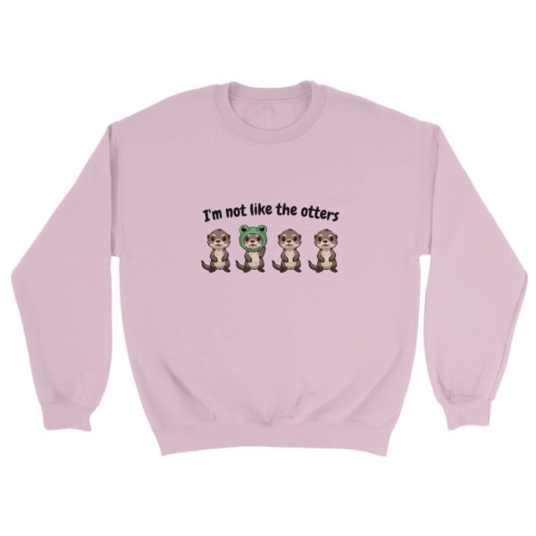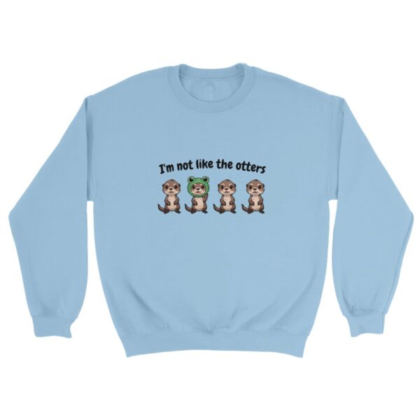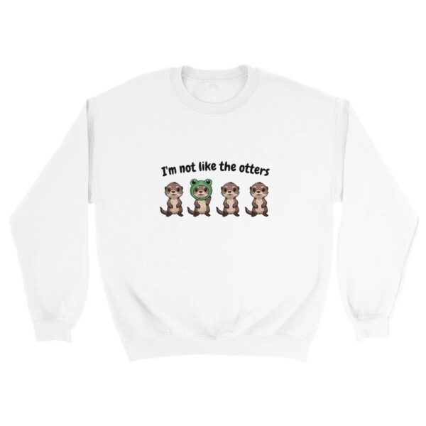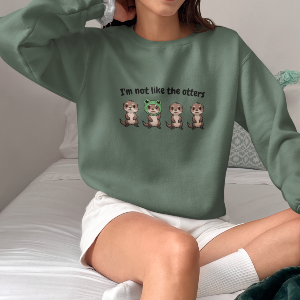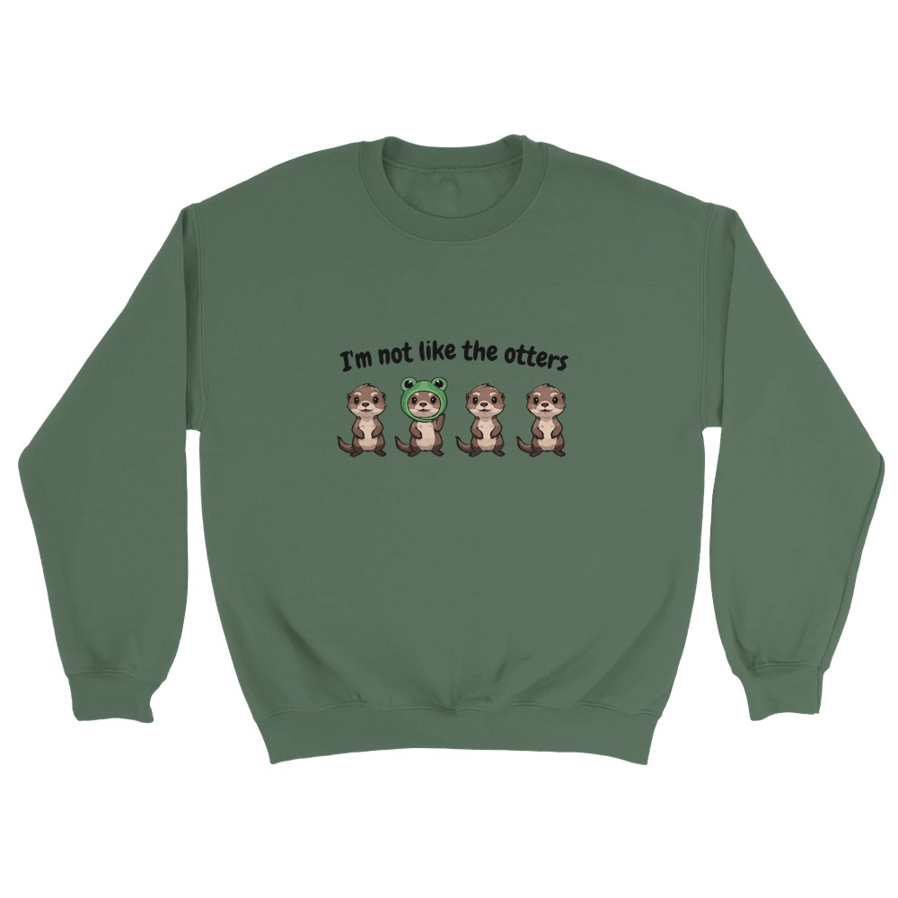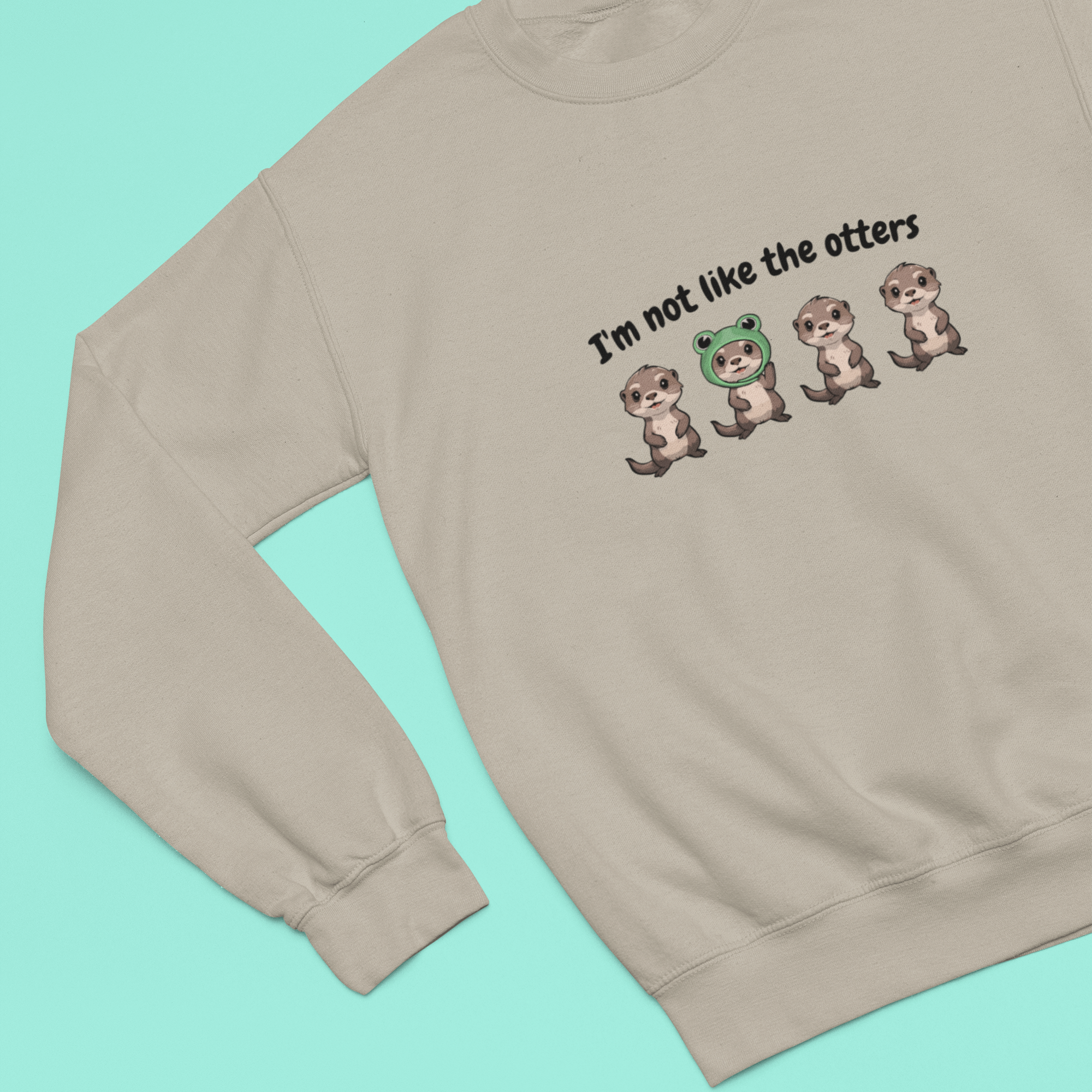 Be not like the OTTERS with this cozy and adorable sweater! Celebrate what makes you unique with this charming sweater featuring a group of otters—one proudly standing out in a quirky frog hat!
